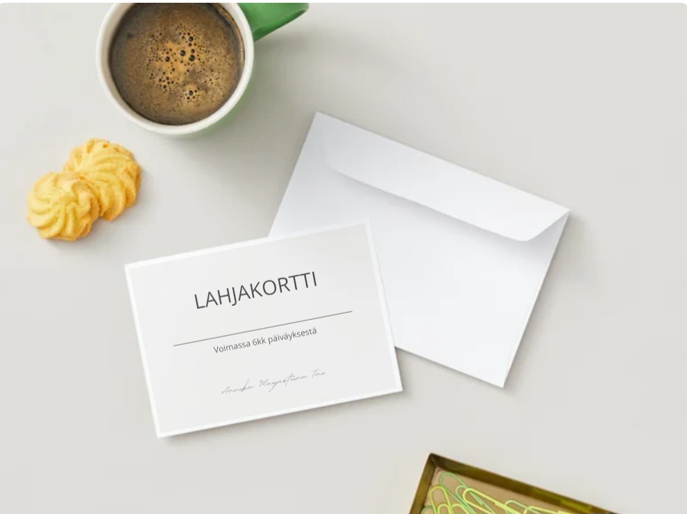 ● Mikäli haluat sähköisen lahjakortin, lähetä sähköpostilla millaisen lahjakortin haluat (annikamaijastiinatmi@gmail.com), niin lähetän kortin sähköpostiin tulostettavaksi tai lähetettäväksi eteenpäin vastaanottajalle. Saat samalla laskun/maksutiedot sähköpostilla.